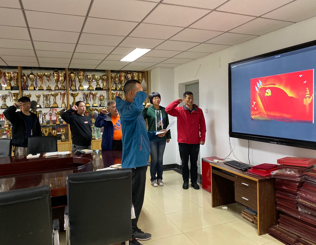 10月11日中午,结合国庆假期期间举办的庆祝中华人民共和国成立70周年阅兵式,支部开展了“我和我的祖国”主题党日活动。活动开始,首先由支部书记刘立伟同志带领支部成员面对党旗,重温入党誓词。随后支部全体成员集体回顾了习近平在庆祝中华人民共和国成立70周年大会上的讲话,以及此次阅兵中的精彩片段。大家相继发表自己的看法,纷纷表示这次阅兵充分彰显了当前我们祖国的强大,使自己从内心收到了鼓舞,深深地为祖国从“站起来”到“富起来”再到“强起来”的伟大奋斗历程而感到骄傲和自豪。