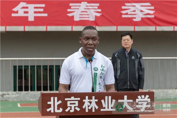 国际学生运动员代表、园林学院博士生奥利弗发言,他希望世界各地的朋友们加入进来,在云上见证北林师生宽容、勇敢、遵守规则、公平竞争的优良品质,共同迎接美好的未来。