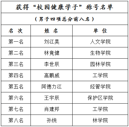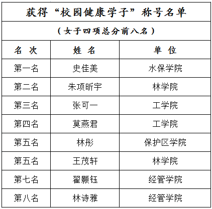 健康学子男女团体前六名分别是园林学院、工学院、信息学院、林学院、水保学院、生物学院。